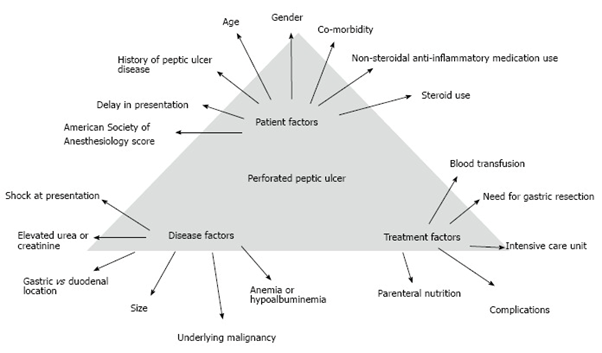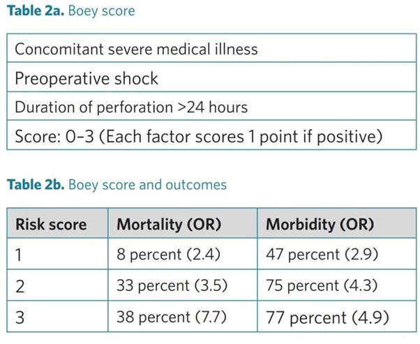 In patients with perforated peptic ulcer, it is suggested to adopt scoring systems (e.g. the Boey, PULP and ASA score) to stratify patient risk and predict outcome.