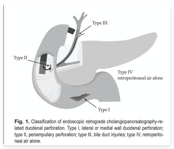 The incidence of iatrogenic lesions after endoscopy is higher in therapeutic procedures, with a reported incidence of 1.6% in cases of ERCP. The Stapfer classification is used for the description of perforations secondary to ERCP.