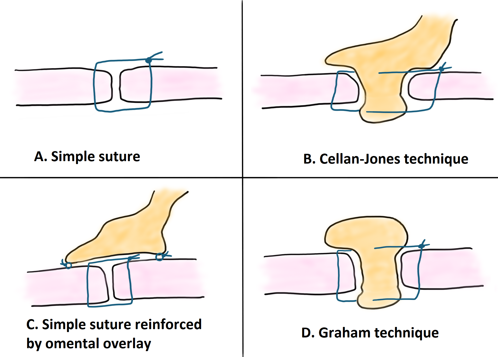 Primary suturing (transverse closure) can therefore be accompanied by the use of a pedicled omental patch (Cellan-Jones technique) or free omental patch (Graham technique).