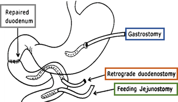 Therefore, the degree of native tissue loss and inflammation will preclude the successful use of certain techniques. It should be noted that, of all the techniques reviewed, only the triple tube technique and pancreas-sparing duodenal resection explicitly describe a distal access for enteral feeding. Nevertheless, enteral feeding, ideally in the form of a nasojejunal tube or a feeding jejunostomy, is advised in all cases, as these patients are usually high-risk and often have not been optimised preoperatively due to the urgent nature of their intervention.