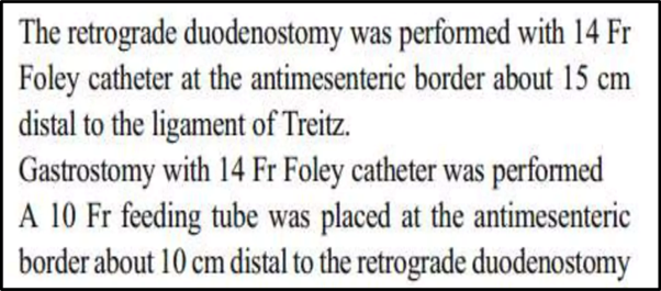 - Finally, a gastrostomy tube is placed to reduce the secretion passing into the duodenum. This technique does not require the re-establishment of continuity.