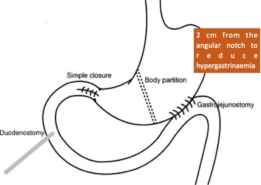 Two case series by Shyu et al. describe the gastric corpus partition technique for the treatment of giant perforated peptic ulcer. This technique involves simple closure of the perforation followed by partitioning of the gastric body with a linear stapler 2 cm proximal to the angular incisure. To re-establish gastrointestinal continuity, a gastrojejunostomy is performed, and a duodenostomy tube is inserted for biliary drainage. It is described that the partition should be performed in the gastric body and not in the antrum to reduce hypergastrinaemia.