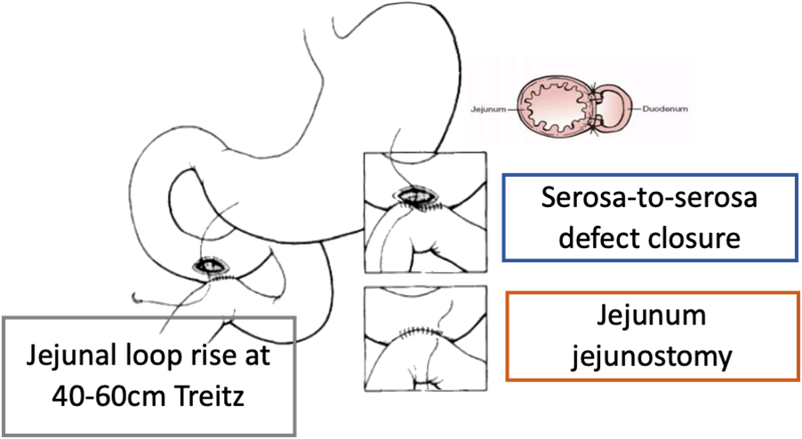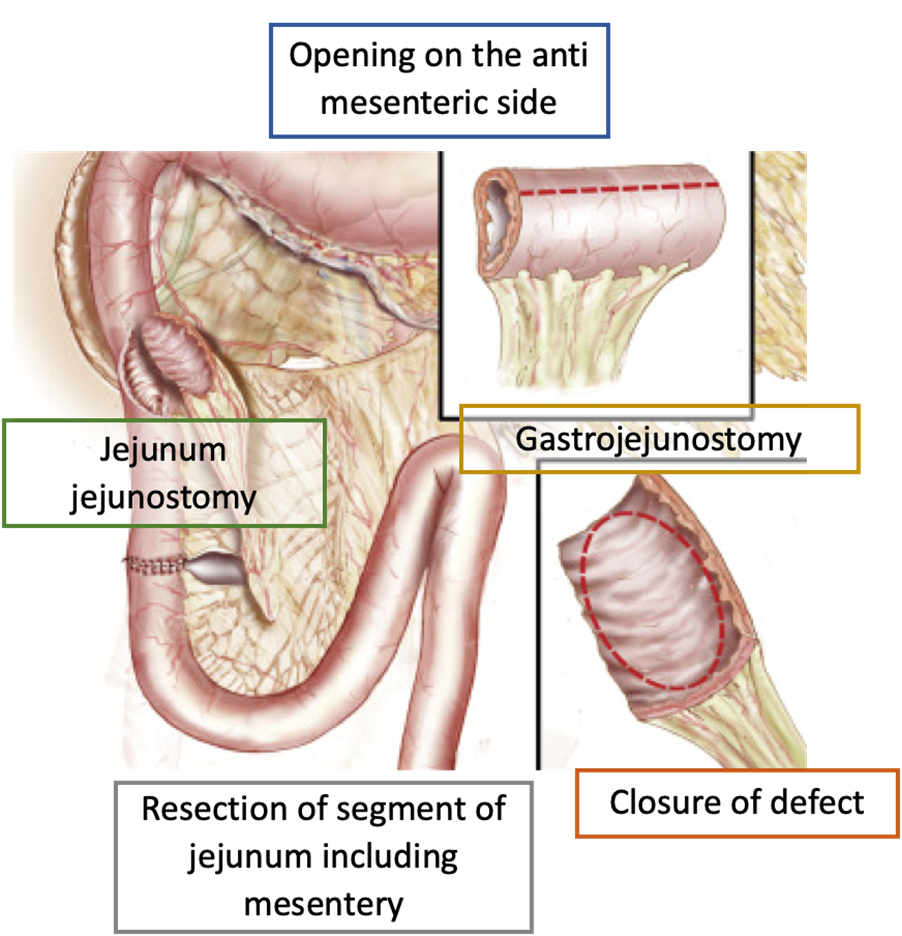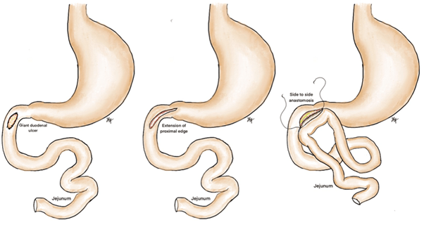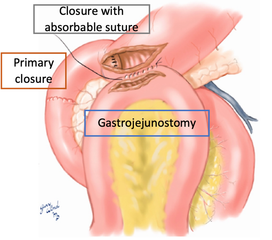 In terms of our setting, this technique aims to close the duodenal defect by covering it with a serosal patch, and, over time, it has been shown that the duodenal mucosa extends over the serosal surface. The serosal patch may cause duodenal stricture or obstruction if used on large defects and is only recommended if one-half or two-thirds of the duodenal wall remains intact. The jejunojejunostomy is used for bypass, so it is not necessary to re-establish gastrointestinal continuity afterwards.