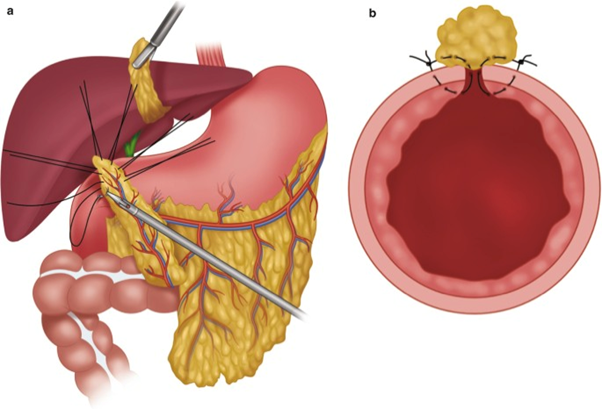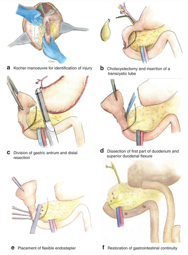 Di Saverio et al. have recently presented a case series of 10 consecutive patients (seven of whom had giant perforated duodenal ulcers) treated with ampulla-sparing duodenectomy without pancreatic involvement for D1/D2 lesions proximal to the ampulla of Vater. This technique involves performance of the Kocher manoeuvre of the duodenum, cholecystectomy, and placement of a transcystic tube down the common bile duct into the duodenum. A distal gastrectomy is performed, which allows the specimen to be flipped and the proximal duodenum to be dissected from the pancreas. A tangentially hinged endograft is used through the healthy duodenum proximal to the ampulla. Gastrointestinal continuity is restored with a Roux-en-Y gastrojejunostomy, and external biliary drainage is achieved with the transcystic tube. This technique resembles a case described by Ntlhe et al.