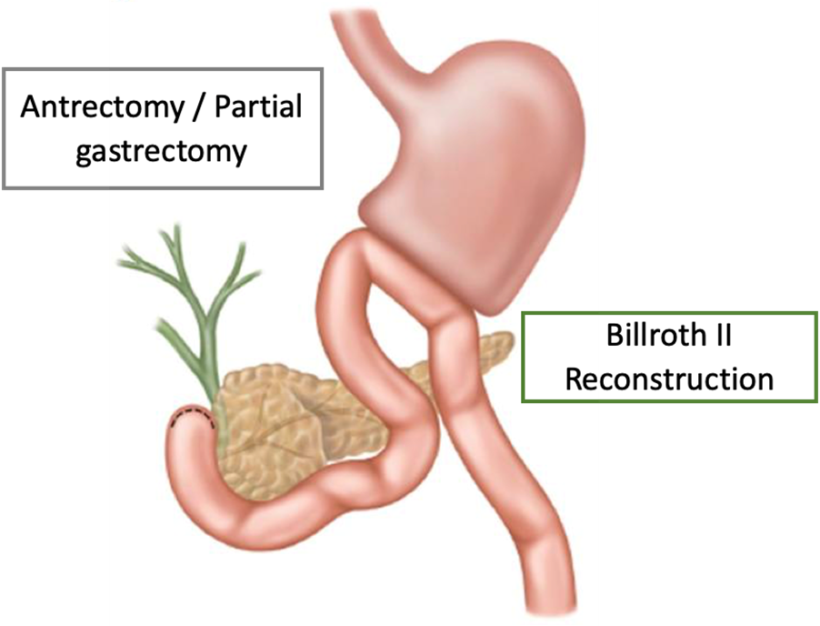Several articles present results after gastric resections for large perforated duodenal ulcers, the most common resection being Billroth II, but Billroth I and atypical resections are also cited in the literature. In a retrospective cohort study of 58 patients undergoing gastrectomy for large peptic perforations, Chan et al. observed a mortality rate of 20.7%. The mean operating time for this procedure was approximately 3 hours, with a mean hospital stay of 13.5 days.