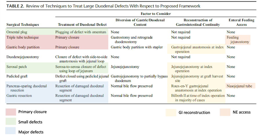 Table 2 (above) provides an overview of the extent to which the techniques reviewed address these four guiding principles and illustrates how the answer to each of the above questions will influence subsequent steps. Two of the techniques, the triple tube technique and gastric corpus partitioning, rely on the duodenal defect being amenable to primary closure. Similarly, serosal patching and omental tamponade require that part of the duodenal wall remains intact, whereas resection techniques such as gastrectomy and pancreas-sparing duodenal resection are not used when there is a greater degree of native tissue loss and inflammation.