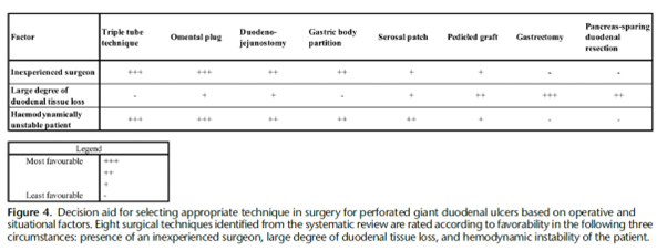 Figure 4 (above) presents a decision aid on the situational and operational factors that may inform the choice between these techniques. The technique chosen from this arsenal will depend on several factors, such as the location of the perforation (especially with respect to the bleb), the degree of duodenal leakage, the degree of contamination, the haemodynamic stability of the patient at the time of the intervention, as well as the surgeon’s experience. Although the current evidence does not support which surgical technique is superior in terms of morbidity and mortality, what is most important is a good understanding of the situation to allow the general surgeon to choose the best technique to perform on the patient.