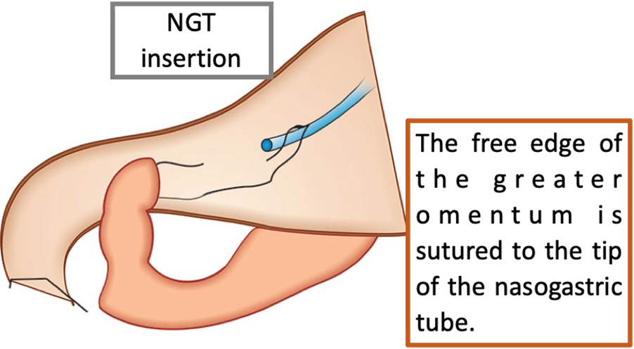 This technique was originally described by Karanjia in 1993. It consists of the insertion of a nasogastric tube, the tip of which is guided through the perforation. The free edge of the greater omentum is sutured to the tip of the nasogastric tube with an absorbable suture, then an omentum plug is pulled into the duodenum to occlude the perforation. The omentum and duodenum are then fixed. The nasogastric tube is removed one week later, after the sutures have dissolved. The authors propose that the main advantage of this technique over the classic omentum patch repair is that while a patch placed on the outside of the defect could be disrupted by increased intraluminal pressure, an omental plug has more continuous contact with the duodenal mucosa.